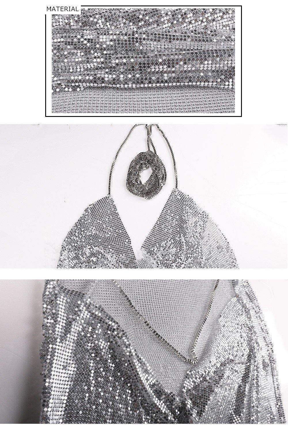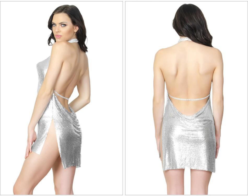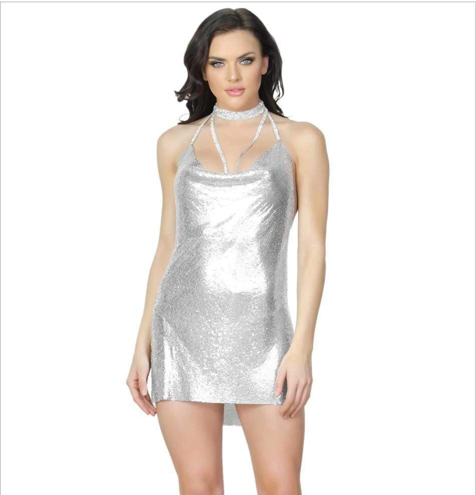 2023 European Fashion Foreign Trade Nightclub Low-cut Halter Strap Deep V Metal Dress