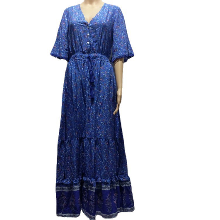 2023 Summer Cross-border European And American Foreign Trade Women's High Waist Tie V-neck Loose Large Skirt Dress Seaside Long Skirt