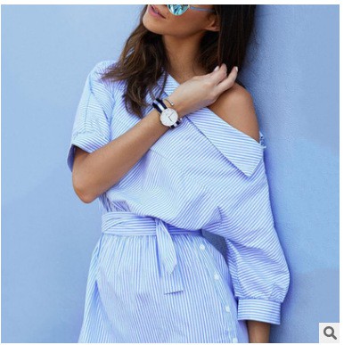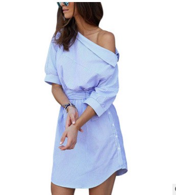 Ebay Amazon AliExpress European And American Hot Sale European And American Striped Belt Slanted Shoulder Shirt Dress
