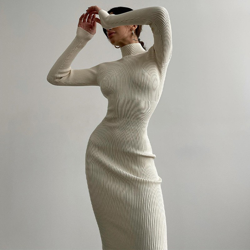 High Collar Mid-length Pit Strip Knitted Skirt Women's Solid Color Wool Knit Tight Sexy Autumn And Winter European And American Dresses