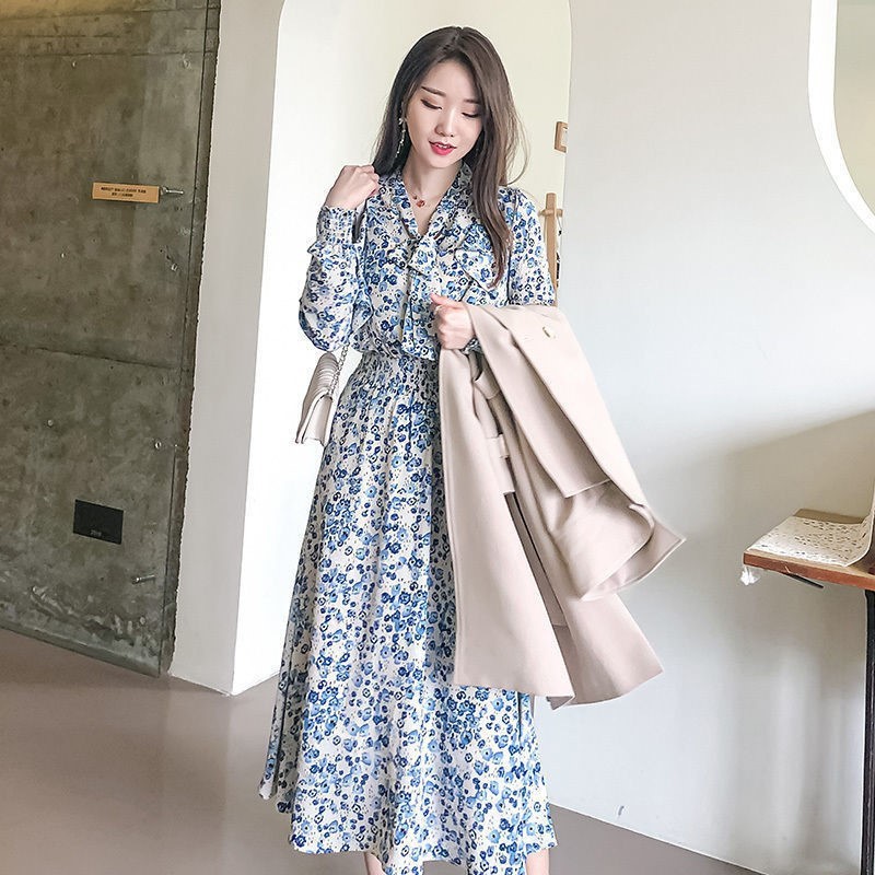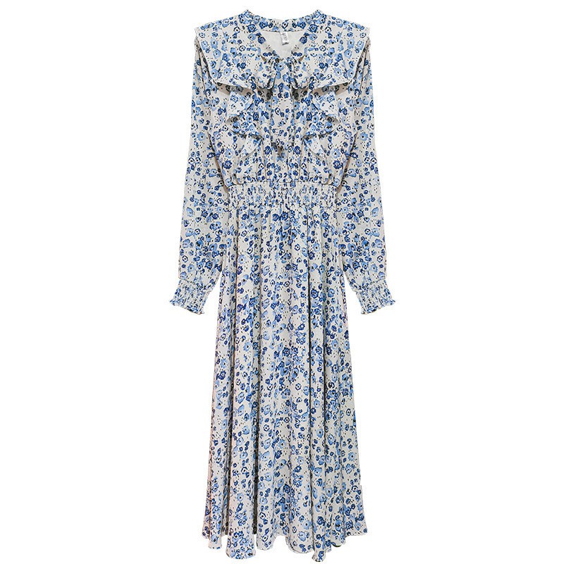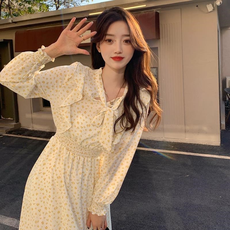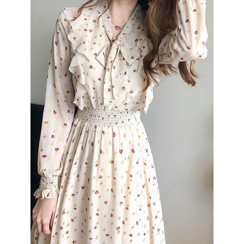 Light-colored Floral Korean Style Long-sleeved Dress