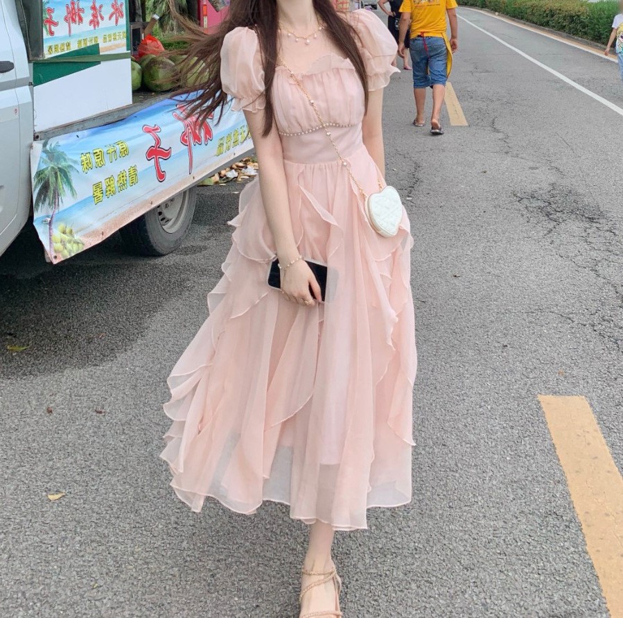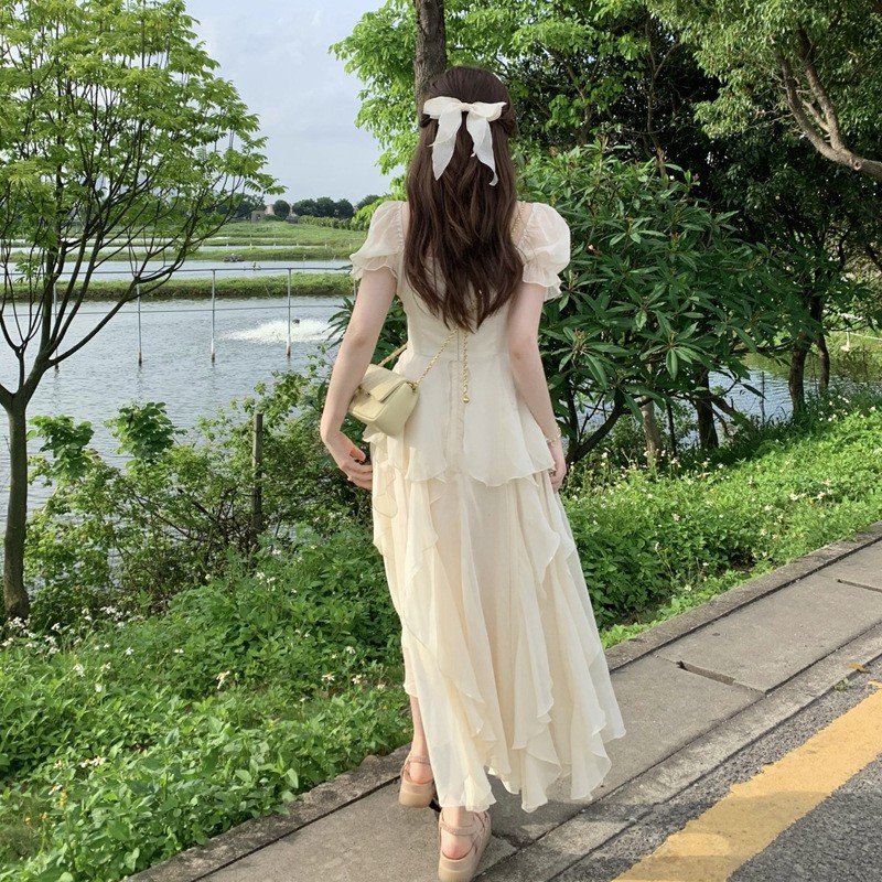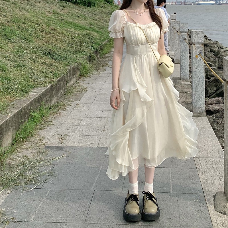 New Temperament French Square Collar New Gentle Long Dress Women's Short-sleeved Summer Skirt