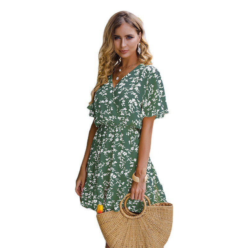 Self-developed European And American Foreign Trade Amazon AliExpress Hot Style Summer Light Green V-neck Floral Waist Dress