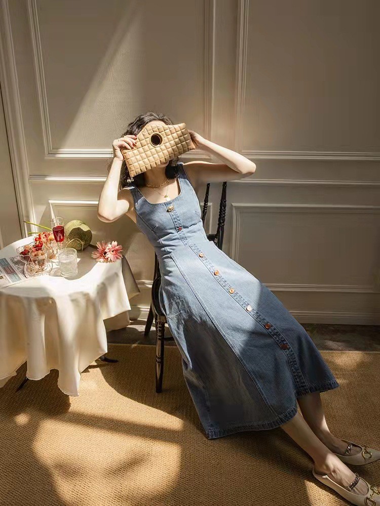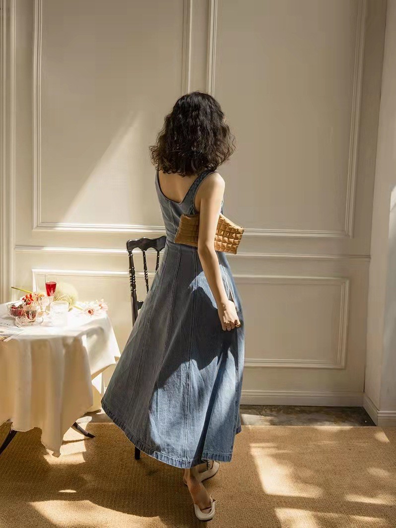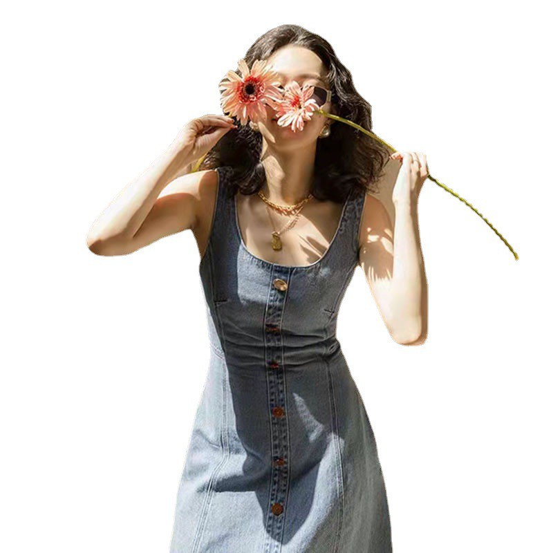 Summer New Suspender Dress Foreign Style Age Reduction Square Collar Slimming Denim Skirt Simple Commuter Suspender Skirt